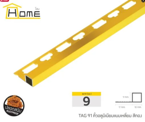 คิ้วเหลี่ยมอลูมิเนียมสีทอง 9มม. ยาว2เมตร ไม่ลอกไม่ดำ