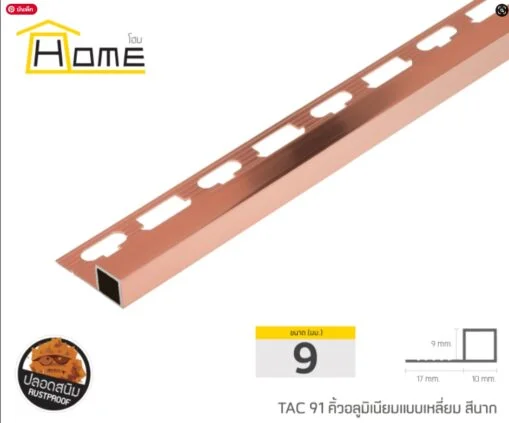 คิ้วอลูมิเนียมแบบเหลี่ยม นอกจากจะมีความสวยงามแล้ว ยังสามารถใช้สำหรับลบมุมกระเบื้องหรือขอบพื้นต่างระดับ ป้องกันการกระแทกของขอบกระเบื้องไม่ให้แตกหรือชำรุด และช่วยปรับระดับการเรียงกระเบื้องให้เป็นแนวตรง ทำให้มุมของรอยต่อระหว่างกระเบื้องโค้งมนและสวยงาม ด้วยคุณสมบัติของอลูมิเนียม จึงมีความคงทน ไม่เป็นสนิม ไม่แตกร้าว และสีไม่ซีดจาง